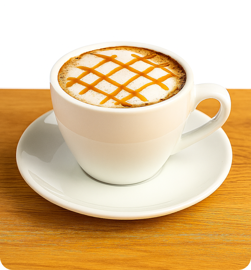 Café espresso con leche vaporizada y espuma, decorado con un delicado toque de jarabe de caramelo. Su sabor combina la intensidad del café con la suavidad de la leche y el dulzor del caramelo, creando una bebida reconfortante y sofisticada.