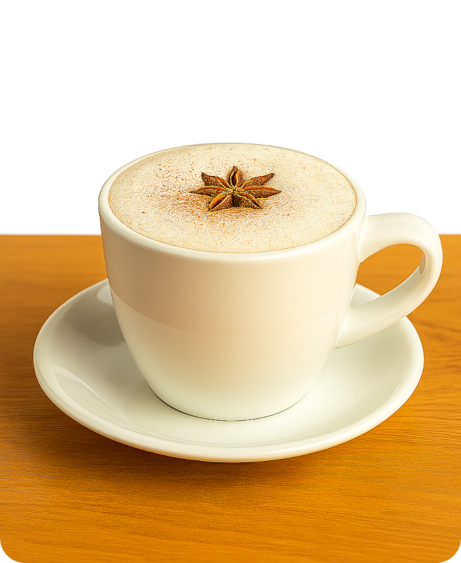 Infusión de té negro mezclado con especias aromáticas como canela, cardamomo, clavo y anís, combinada con leche vaporizada para lograr una bebida cremosa y reconfortante. El Chai Latte ofrece un equilibrio perfecto entre dulzor, intensidad y notas especiadas que evocan la tradición india en una versión moderna y acogedora