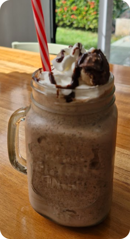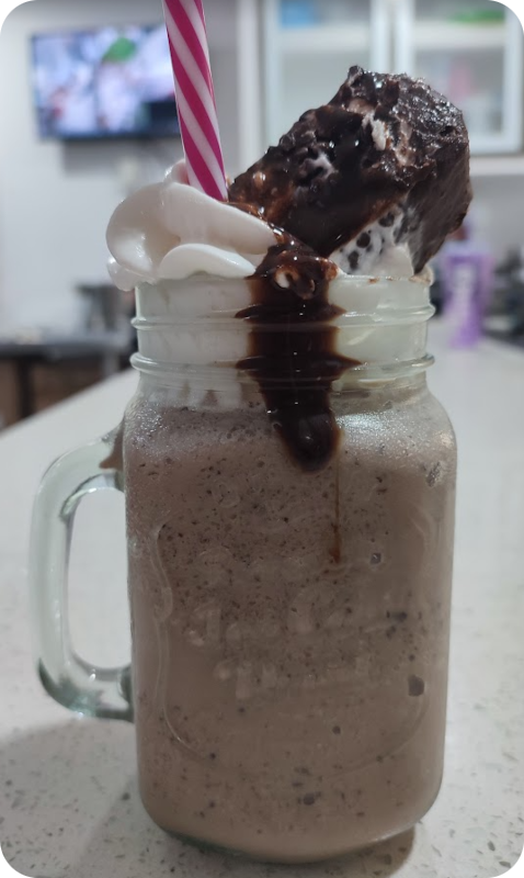 Bebida frappé elaborada con helado de vainilla, leche, hielo y trozos de galleta de chocolate, mezclados hasta lograr una textura espesa y refrescante. Se sirve con crema batida, jarabe de chocolate y una galleta entera como topping.