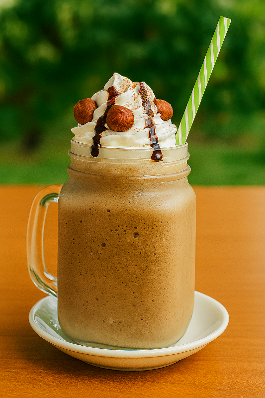 Bebida frappé elaborada con café frío, leche, hielo y esencia de avellana, mezclados hasta lograr una textura suave y refrescante. Se sirve con crema batida, jarabe de chocolate y avellanas troceadas o enteras para un toque crujiente y aromático.