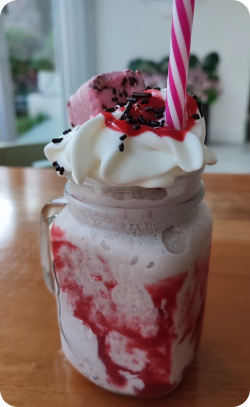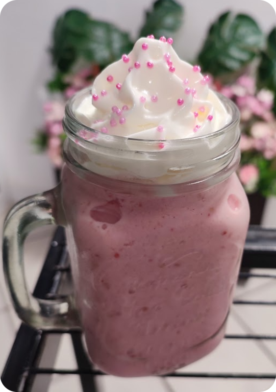 Inspirado en el icónico estilo de Barbie, este frappé combina frambuesa, crema de coco y leche evaporada, mezclados con hielo para lograr una textura cremosa y vibrante. Se sirve con crema batida teñida de rosa, glitter comestible y cereza decorativa para un toque glamuroso y divertido.