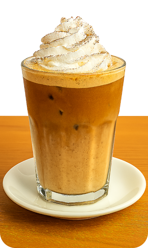 Bebida frappé a base de café, hielo y leche, mezclada hasta lograr una textura suave y espumosa. Se sirve con crema batida y puede incluir jarabes como vainilla, moka o caramelo. Refrescante y indulgente, es ideal para quienes buscan una experiencia dulce y energética.