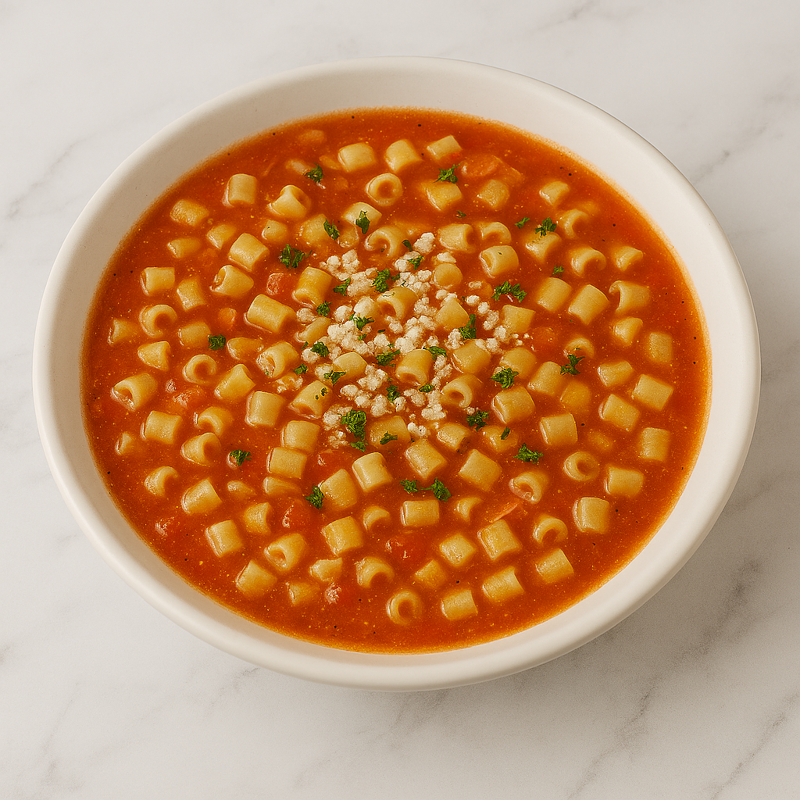 Tradicional caldo de jitomate con pasta suave tipo codito, servido caliente en plato blanco. Ideal como entrada reconfortante.